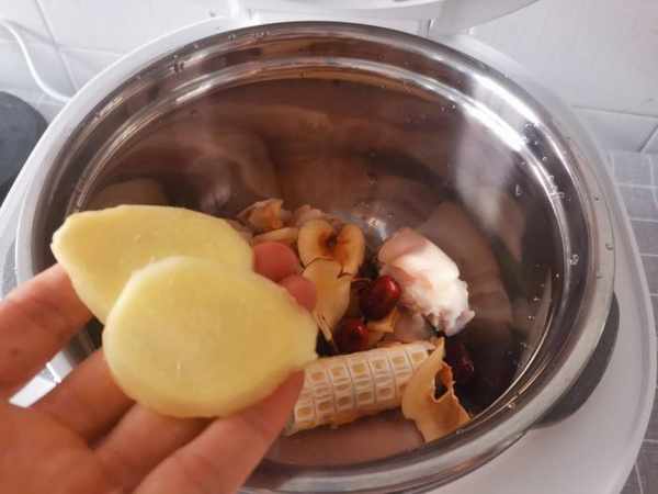 第六步:然後再加入2片生薑,生薑可以很好的去除异味,做菜做湯都少不了的一味調料。