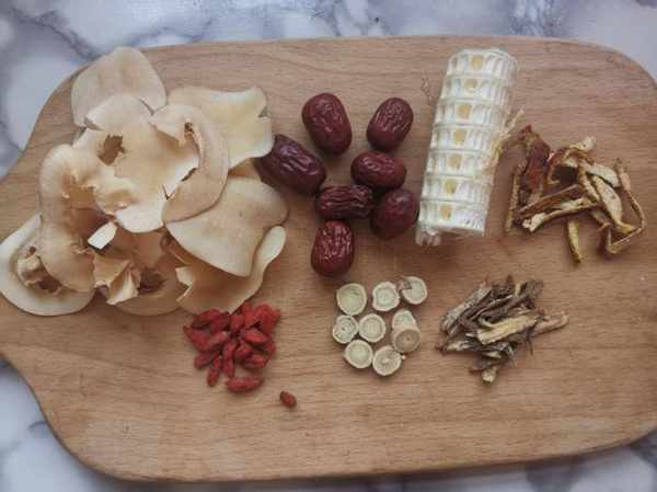 第一步:先把海底椰,紅棗,枸杞,當歸,黃芪,薑片,陳皮,鯊魚骨全部備好。這些配料不但可以滋養身體,還可以去除异味,提鮮增香。尤其女人在平時當歸黃芪適當吃點可以滋補氣血,做湯放上一點就是很不錯的選擇。