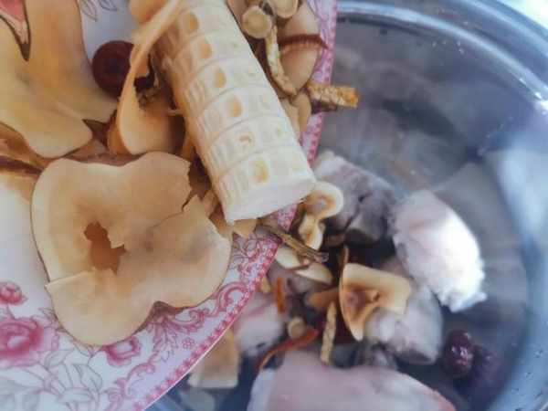 所用資料:猪蹄1只,海底椰適量,紅棗,枸杞,當歸,黃芪,薑片,陳皮,鯊魚骨,料酒。