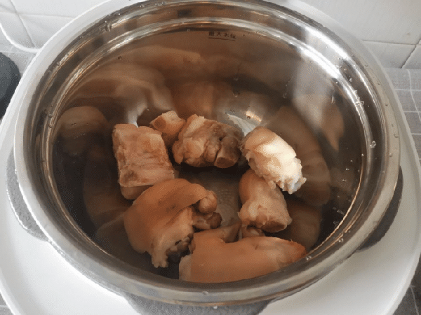 第八步:時間到了,打開飯煲就可以看到清爽的湯汁,軟糯的猪蹄。看起來就很好喝,這時加入鹽和少許雞精調味,這款湯即成。