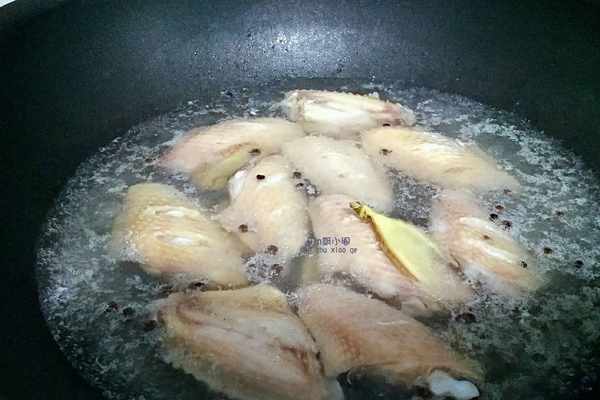 3.鍋入清水,下雞翅,加入薑片和料酒,大火燒開撇去浮沫,將雞翅撈出。