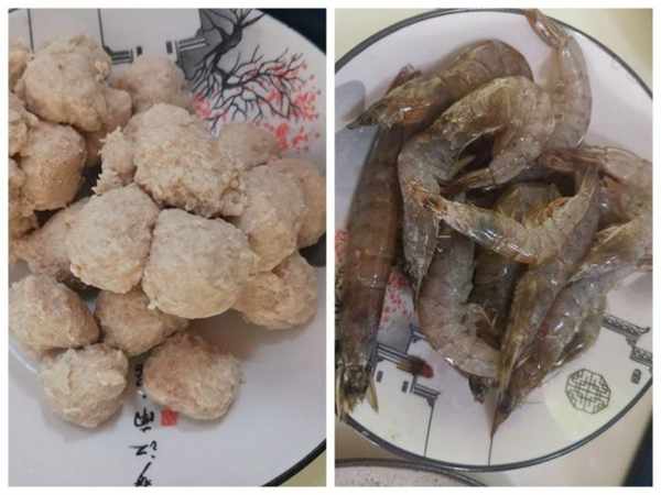 自己做的肉丸,鮮蝦剪去蝦毛和蝦槍,挑去蝦線,裝盤。