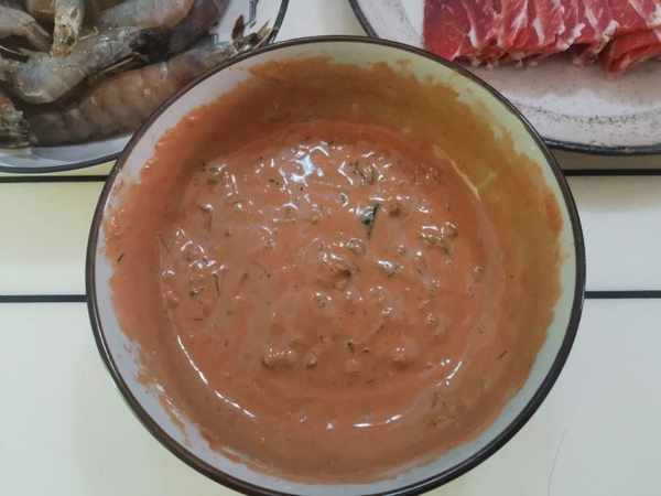 把麻汁加適量的清水泄開,加入一塊腐乳,醋1勺,生抽一勺一起攪拌均勻成為糊狀。