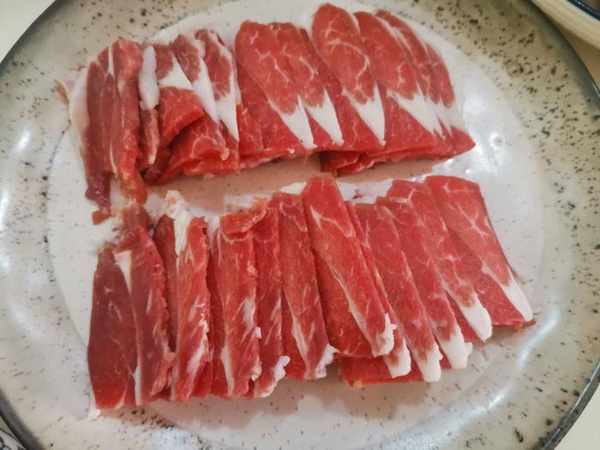 然後把提前買來的羊肉切成片,擺盤。自己買的鮮羊肉凍起來,拿出切片比直接買羊肉片好。