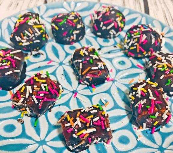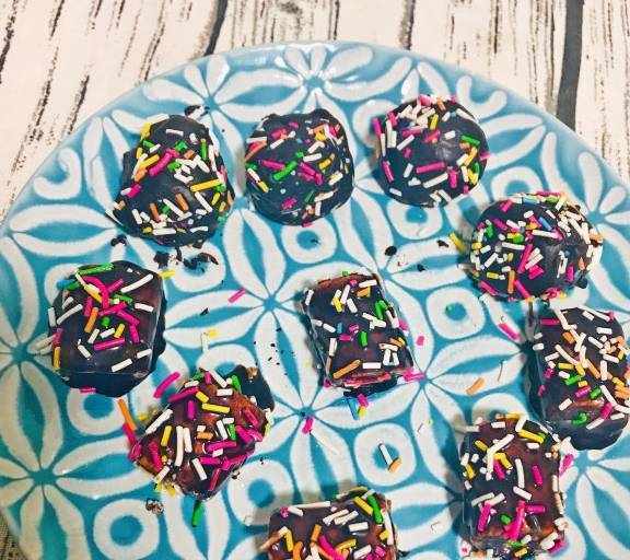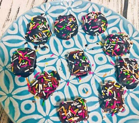 第7步、沾滿巧克力後,先讓過瞭6-7秒就撒上糖果針。