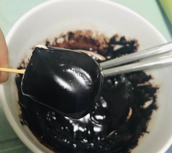 第6步、棉花糖用牙簽插著,放入巧克力碗裡沾一下。