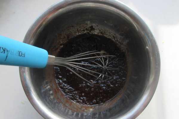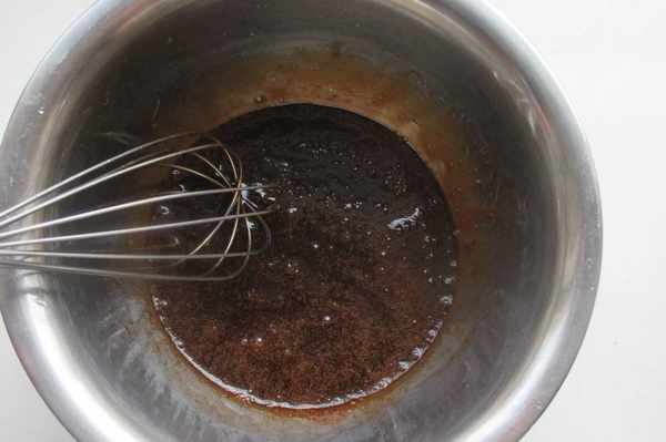 4.隔水融化,慢慢攪動,至紅糖全部軟化掉。隔水融化,就是將盆坐在熱水中攪拌,將其融化