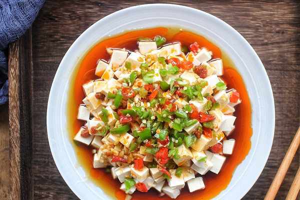 4、最後把剛剛切好的紅青尖椒倒入在豆腐上,再將剛剛調好的料汁也淋在豆腐上即可