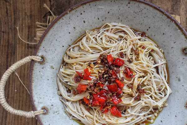 材料:金針菇一大把、生抽適量、香醋1到2勺、鹽少許、尖辣椒適量、花椒適量、香油適量