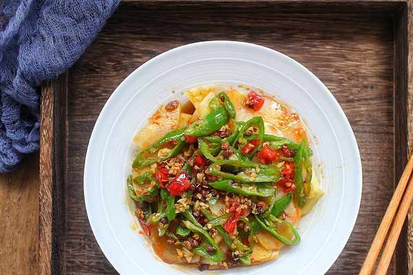 材料:土豆1個、青辣椒1個、尖辣椒適量、蒜瓣適量、花椒適量、生抽1勺、辣椒油2勺、醋小半勺、白糖少許