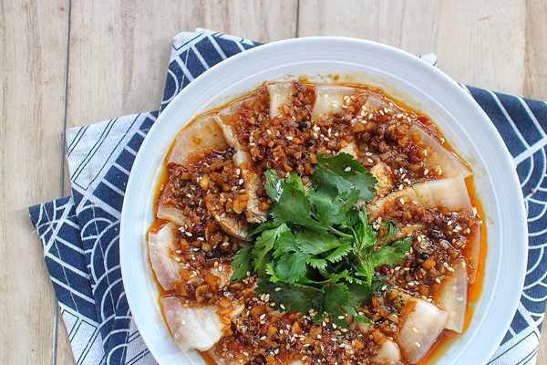 5、我們將之前切成碎丁的蒜粒和白芝麻倒在五花肉表面,最後將炒好的調料汁淋在白肉上即可,真的特別好吃
