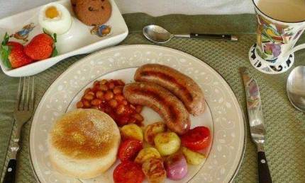 第二個是英國的早餐!英國的早餐看起來還是比較豐富的,豆子、香腸、雞蛋、水果、餅幹什麼的,看起來也是應有盡有,還有咖啡奶茶,但是對於中國人來說,香腸和臘腸這樣的東西在早上吃確實是有一點油膩瞭!