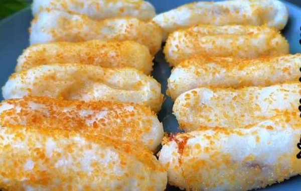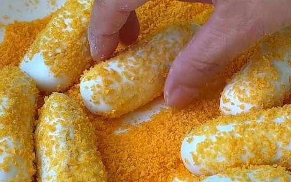 再放入面包糠裡滾一圈,使糍粑的表面都均勻的裹上一層面包糠鍋燒熱,倒入稍微多一點的油。