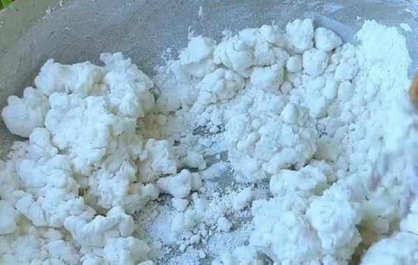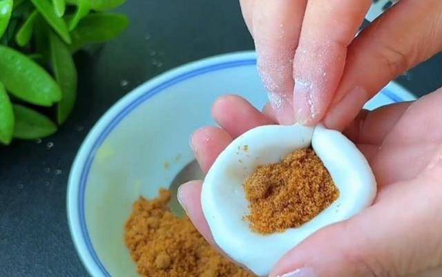 準備一些紅糖粉,取一勺倒入裡面,再把它包起來,封口處要捏緊,否則紅糖會露出來,然後把它搓成光滑的圓形,再搓成長條。