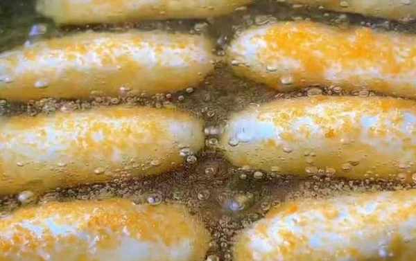 油熱放入糍粑炸,一個一個的放入防止粘連在一起,用中小火慢慢的炸,不要用大火炸,否則紅糖會爆出來。