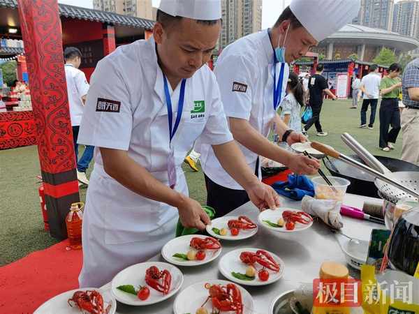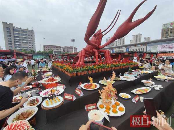 極目新聞記者關註到,在大賽現場還設立瞭“荊楚購”潛江特色美食展示展銷區域,邀請入選潛江美食地圖的60傢特色美食名店進行現場展示,預計將持續至5月22日。通過大賽集聚人氣,參展企業采取現場品鑒、直播帶貨、有獎銷售、民俗表演等靈活多樣的促銷方式,塑造潛江美食品牌,吸引遊客消費,擴大潛江特色美食的銷售,打造龍蝦節廟會現場。