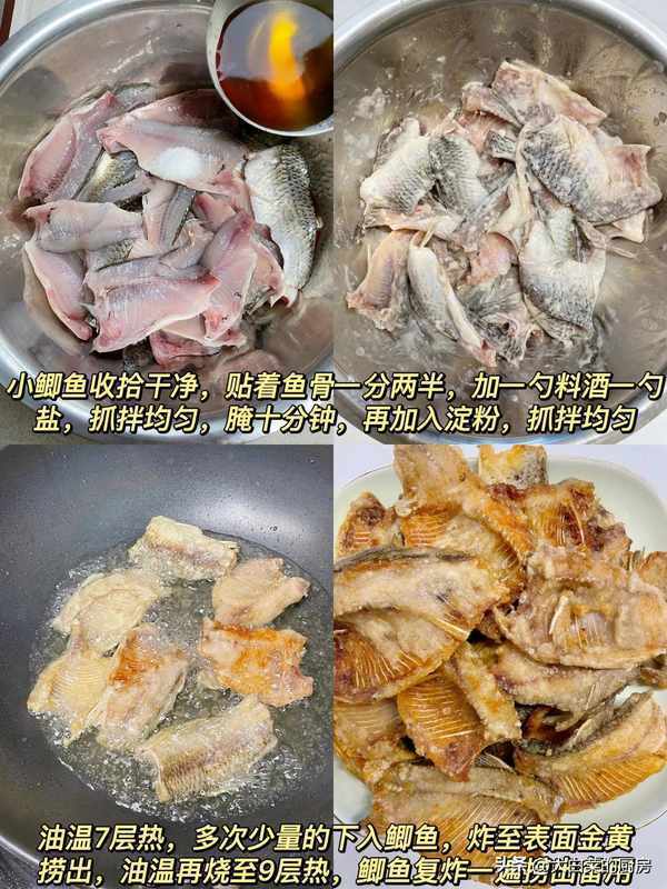 首先我們將買回來的小鯽魚清洗幹凈,貼著魚骨切薄片,按照下圖所示的方法醃制十分鐘,然後加入淀粉,抓拌均勻!