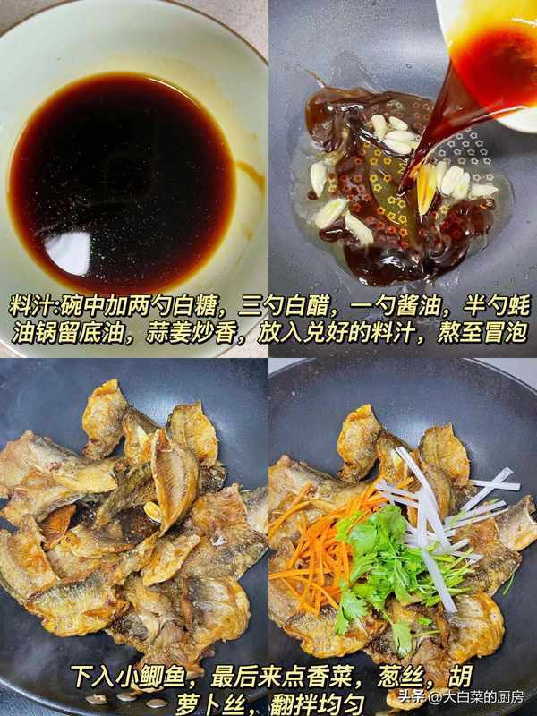 這個時候我們來調一個糖醋汁,起鍋燒油,油熱倒入糖醋汁,小火熬至冒泡後加入炸好的鯽魚,最後來點香菜段、胡蘿卜絲和蔥絲,翻炒均勻後即可出鍋!