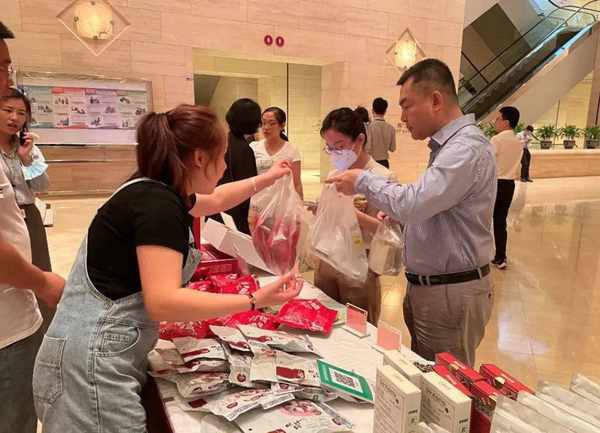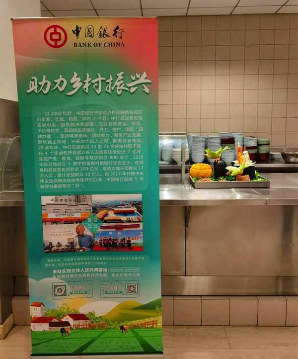 此外,淳化縣大槐樹村作為總行定點幫扶村,在總行餐廳專門設置瞭展位,結合總行數字人民幣支付滿減活動,宣傳“大槐樹優品”抖音賬號,現場推介馬欄紅蘋果、旱地櫻桃、深山羊肚菌、水煮瓜子等優質幫扶農產品。