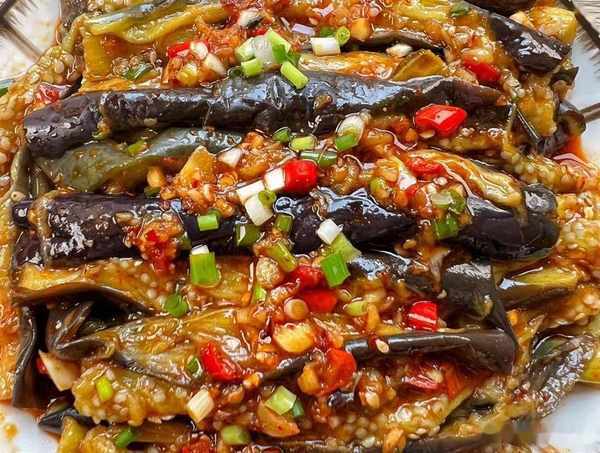 做法:茄子切段上鍋蒸熟,手撕成條備用