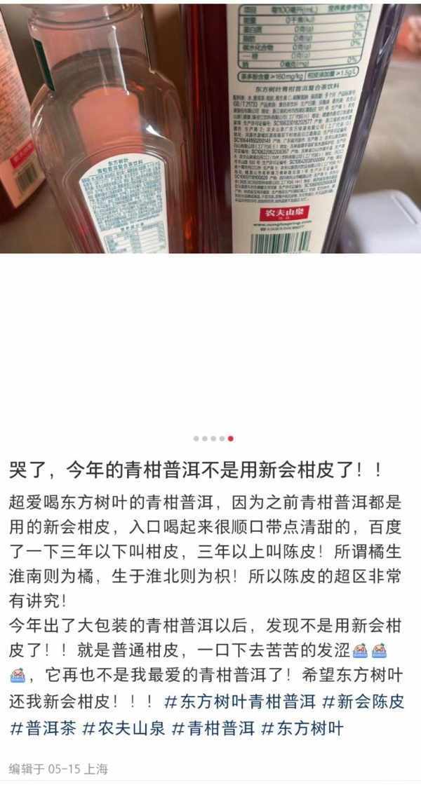 上遊新聞(報料郵箱baoliaosy@163.com)記者在小紅書上看到,一名網友發佈瞭《哭瞭,今年的青柑普洱不是用新會柑皮瞭》帖子:“超愛喝東方樹葉的青柑普洱,因為之前青柑普洱都是用的新會柑皮,入口喝起來很順口帶點清甜的。今年出瞭大包裝的青柑普洱以後,發現不是用新會柑皮瞭!就是普通柑皮,一口下去苦苦的發澀,它再也不是我最愛的青柑普洱瞭!希望東方樹葉還我新會柑皮!”