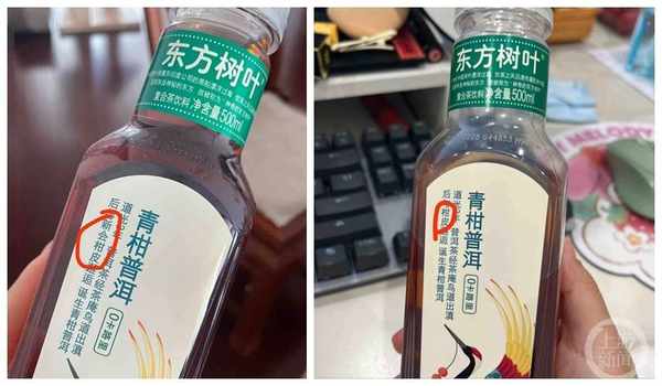 最近一段時間,在小紅書等社交平臺上,很多網友吐槽農夫山泉出品的東方樹葉系列飲品之青柑普洱“沒以前好喝瞭”。還有網友曬出新老產品的對比圖:以前的青柑普洱,外包裝上標明使用的是“新會柑皮”,但現在變成瞭普通的“柑皮”。