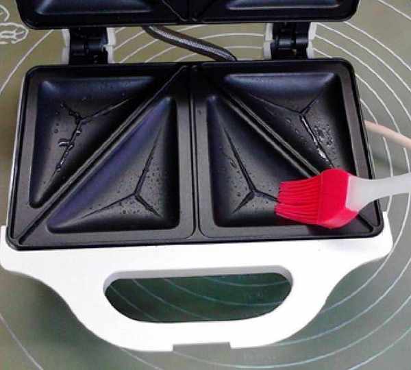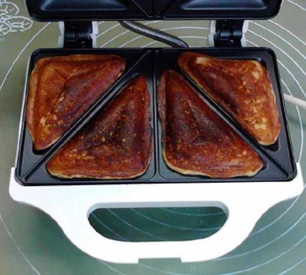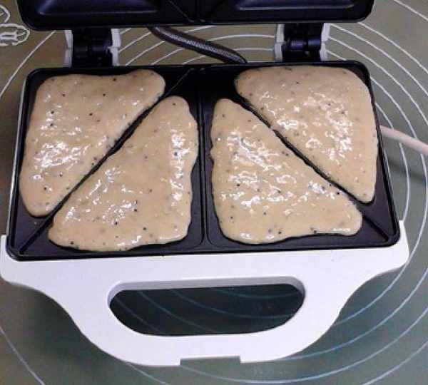 第9步、將面糊倒入三明治機的三角格子內,