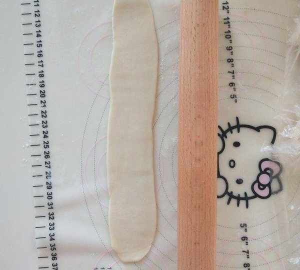 第9步、9.再次搟開,長度和搟面杖差不多就行,太長容易混酥!