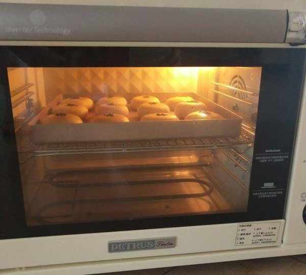 第13步、13.壓扁些放入學廚9055烤盤中,表面刷蛋黃液,撒黑芝麻裝飾!