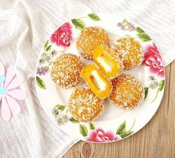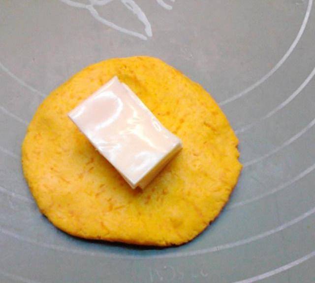 原料:南瓜、白糖、葉兒粑粉、芝士片、面包糠、食用油。