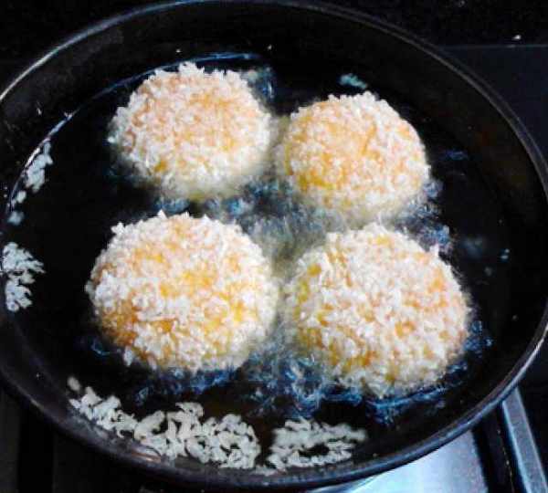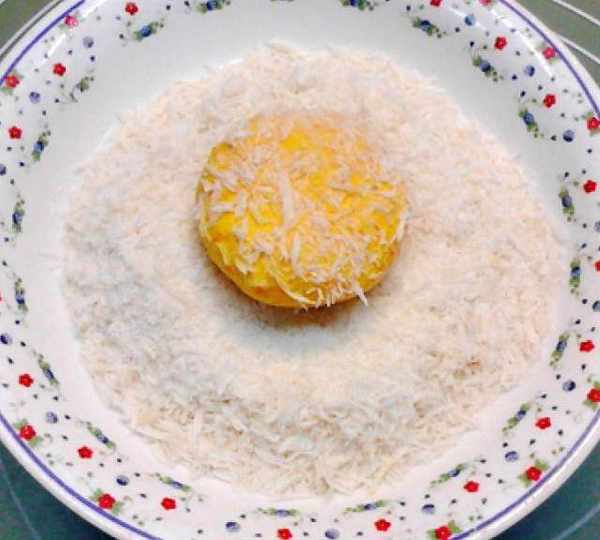 第12步、粘少許水,放入面包糠中裹上一層面包糠。