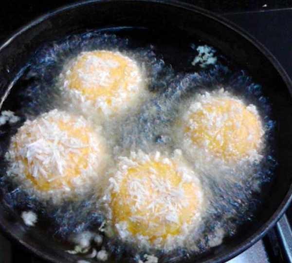 第15步、放入做好的南瓜餅,中小火煎炸。