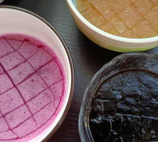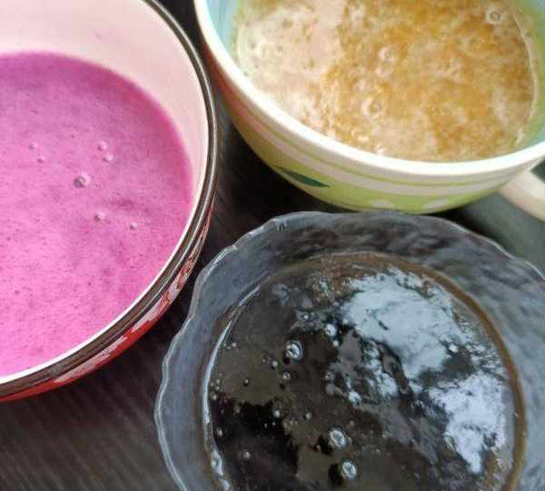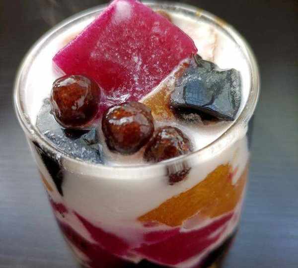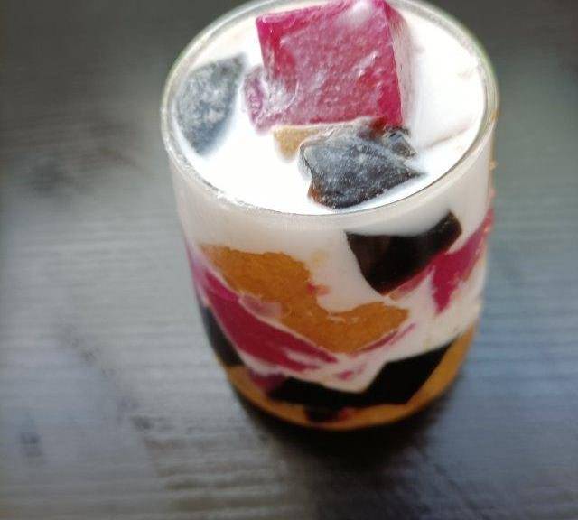 杏醬和火龍果銀耳露做的彩色果凍,用燒仙草作為黑色果凍。