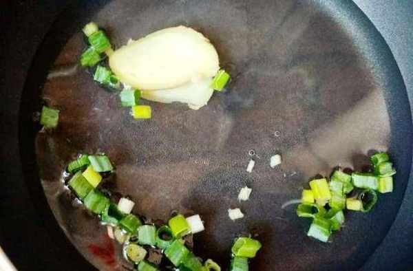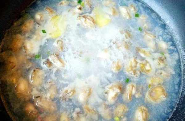 第三步:鍋中加入水,放入薑,蔥花等水煮沸後,放入海蠣,煮至熟透,最後加地瓜粉勾芡,芡汁濃稠加鹽味精調味即可出鍋。