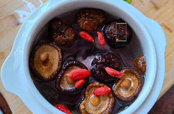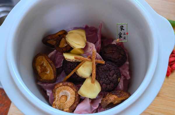 5、加完豬心後把香菇也撒到鍋裡,然後再加入生薑和當歸。香菇和生薑的香味可以幫助去腥,而當歸溫和滋補的效果最適合煮湯。