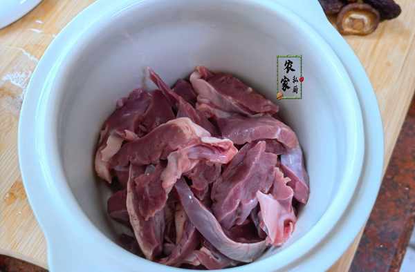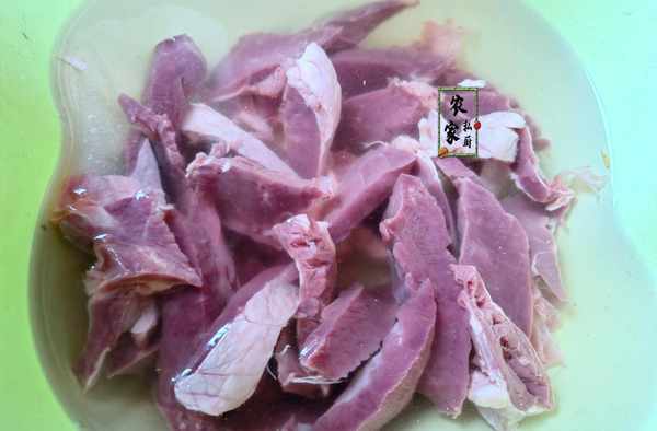 2、把切好的豬心用清水將多餘的血水沖洗幹凈,然後將豬心放到清水中泡上三十分鐘左右的時間。