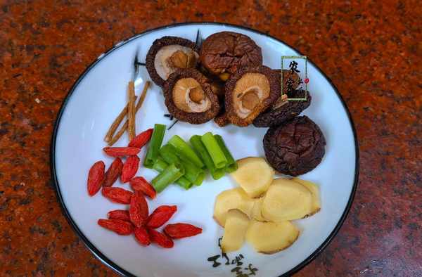 3、除瞭豬心之外,還有好幾個食材也十分重要。將香菇、枸杞、當歸用水洗幹凈盛放到盤子裡。生薑和蔥洗凈後再用刀切好,等會就要用它們來去腥。
