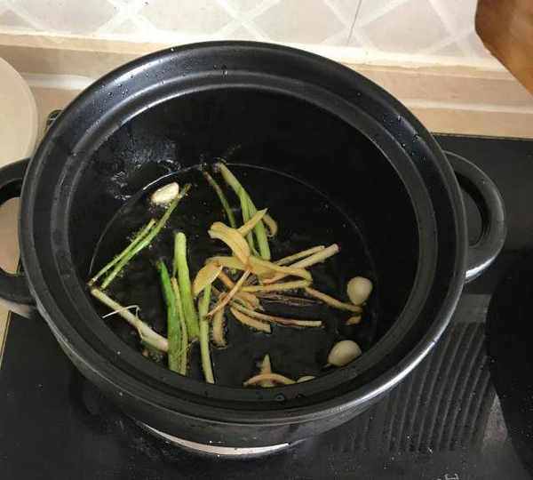 第4步、砂鍋放食用油,蔥薑蒜爆鍋。