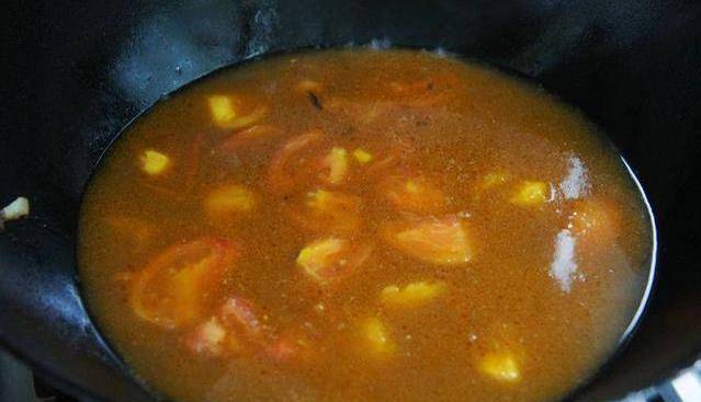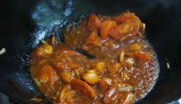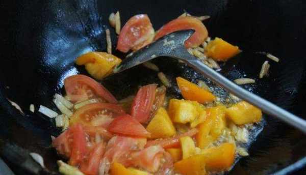 3、炒鍋加入適量的油,爆香五香粉、蔥薑蒜,加入番茄翻炒出湯;