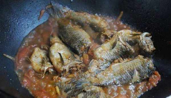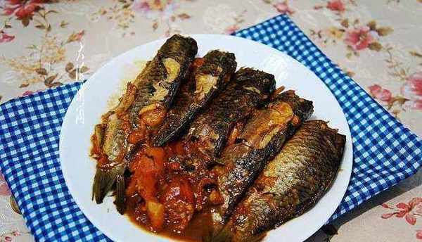 食材:鯽魚300g;番茄2個;油、蔥、薑、蒜、五香粉、香其醬、料酒各適量。