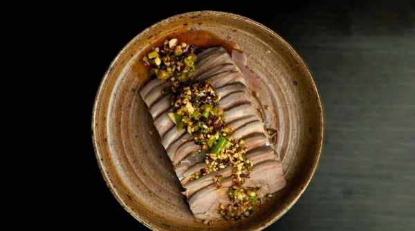 最後把凍好的羊肉取出切成片裝盤,將調好的醬汁淋在切成片的羊肉上即可。