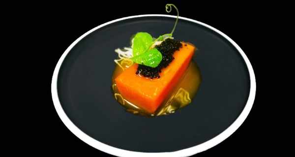 上菜前把蜜薯取出擺盤,再放上黑魚籽,旁邊放上椰子絲,淋上蜜薯汁,用龍須苗裝飾即可。