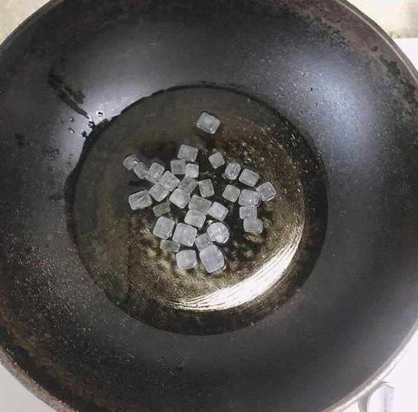 2、鍋裡倒入適量食用油,把適量冰糖倒入進去,