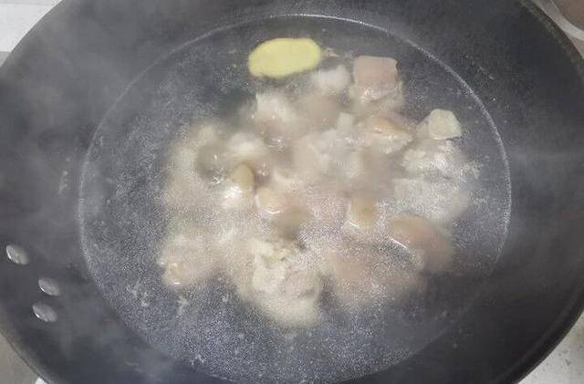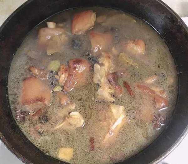 開大火煮沸,然後用勺子舀去一些不要的浮末,把豬蹄撈出控水備用。