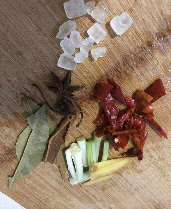 開小火熬制成焦糖色時倒入之前備用的豬蹄,翻炒均勻使豬蹄顏色變深,然後把八角、桂皮、蒜段和少量幹辣椒倒入進去翻炒提香,然後加入適量清水,