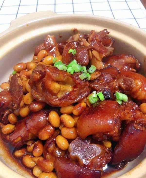 豬蹄8個黃豆800g八角2個香葉2片桂皮1個冰糖適量幹辣椒適量薑段蒜段適量老抽2勺生抽3勺料酒3勺蠔油1勺