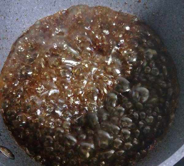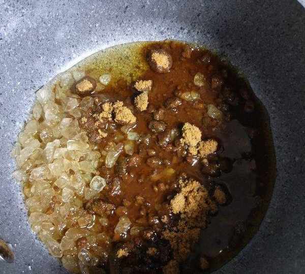 第9步、將梨和火龍果切塊,葡萄幹和烤花生碎,紅糖汁。