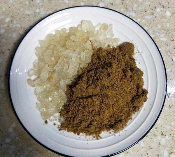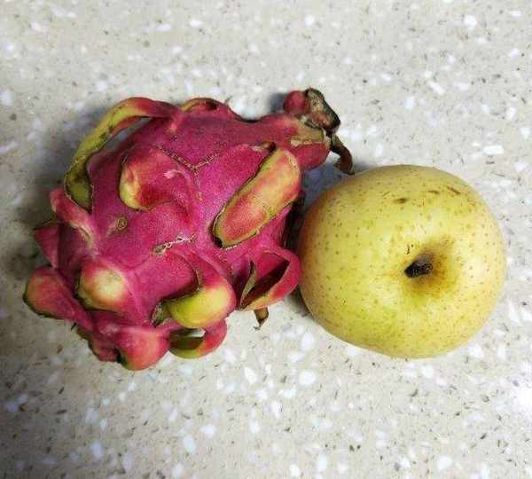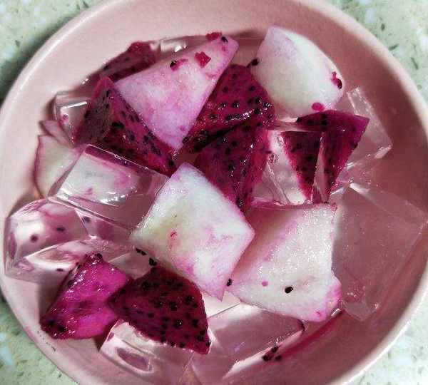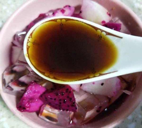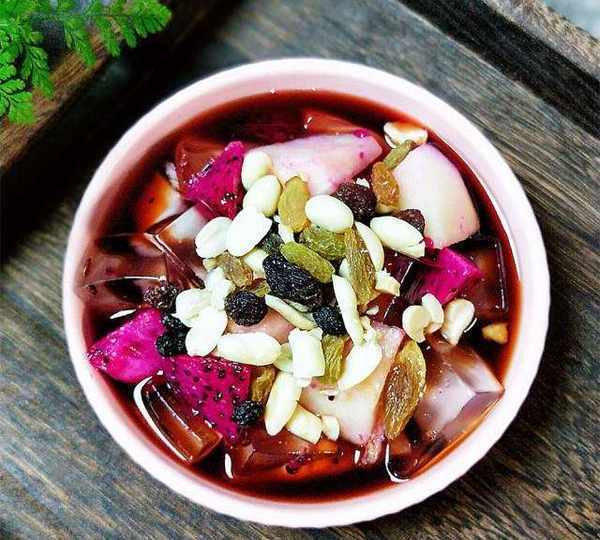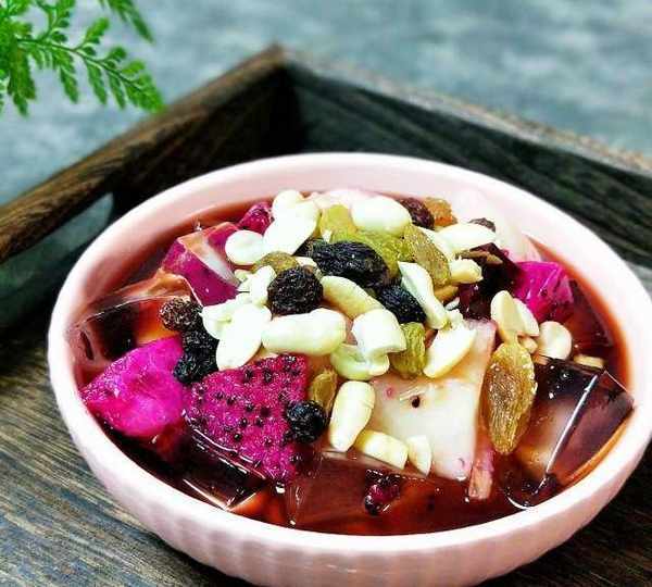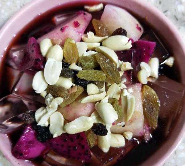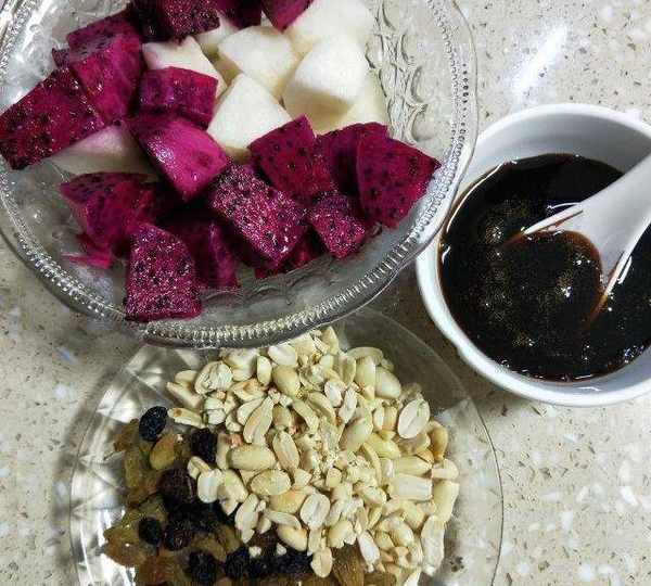原料:火龍果、梨、白涼粉、清水、烤花生、葡萄幹、冰糖、紅糖、清水。