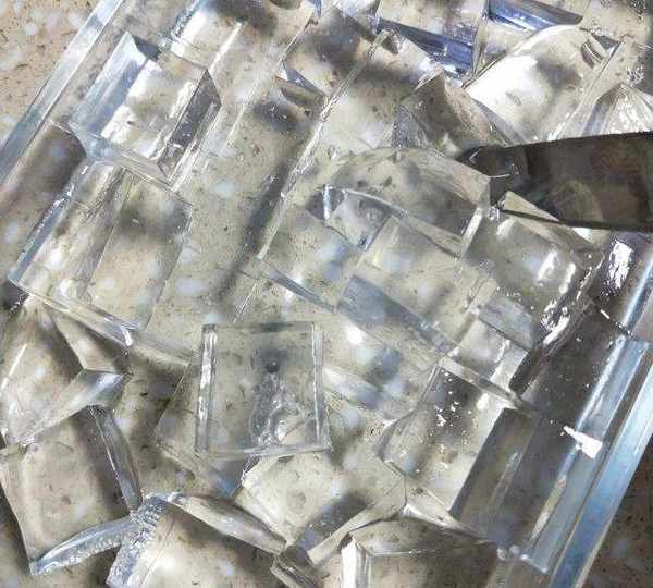 第10步、白涼粉已凝結,用水果刀劃成小方塊。喜歡也可以放冰箱冷藏一下,更冰爽。