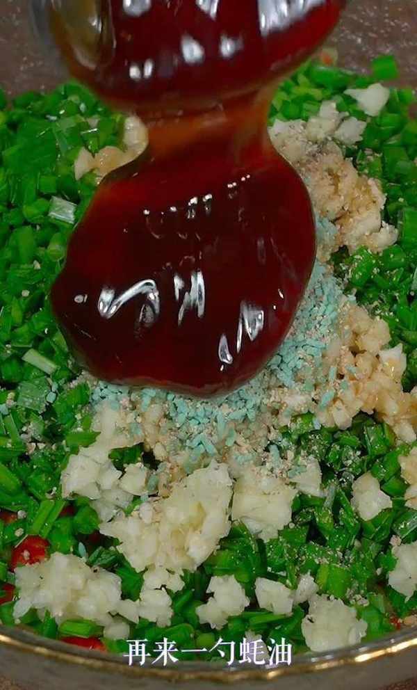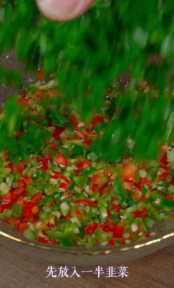 再準備點本地韭菜,切得越脆越好,先放入一半韭菜,蒜蓉,鹽,兩勺生抽,少許雞精和胡椒粉。